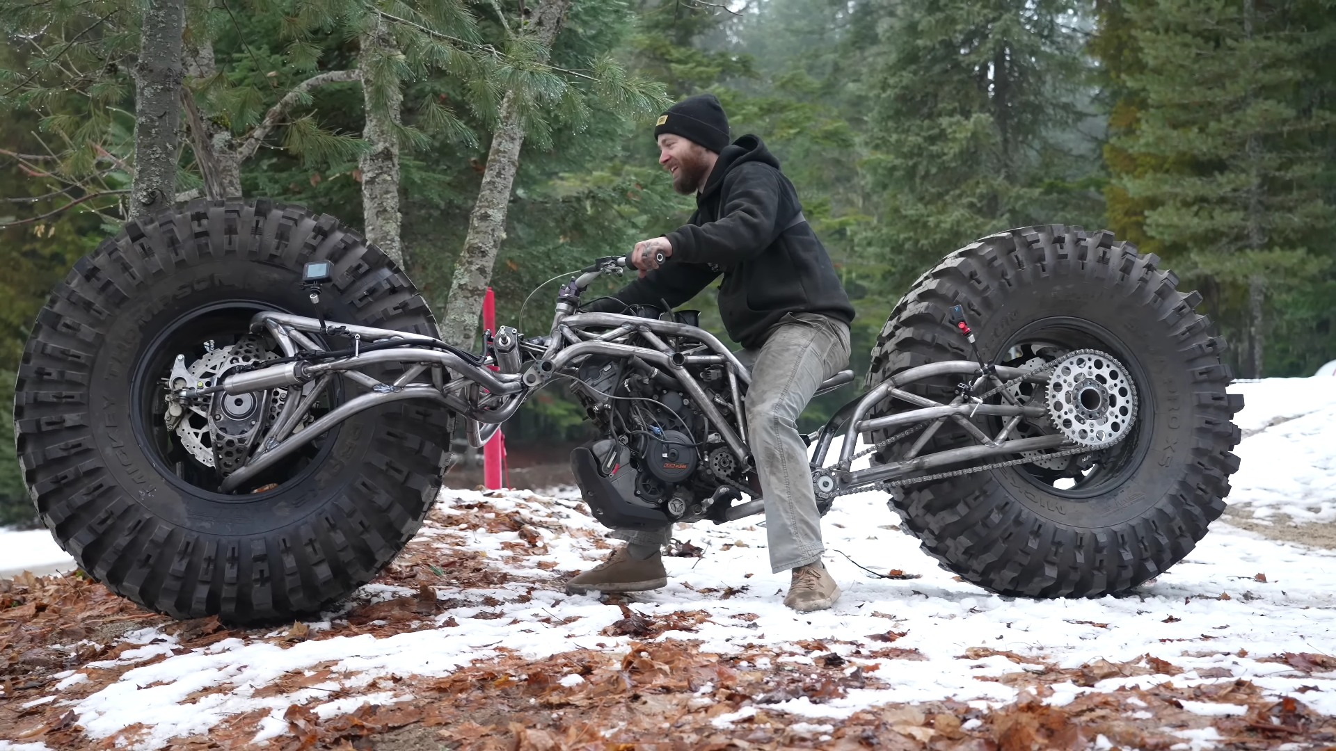 With 46-inch tyres at both ends, this isn’t a bike you sit on so much as in. Even still, the seat is perched above an engine stolen from a KTM 1290 Super Adventure and therefore puts 160bhp in the rider’s outstretched right hand.