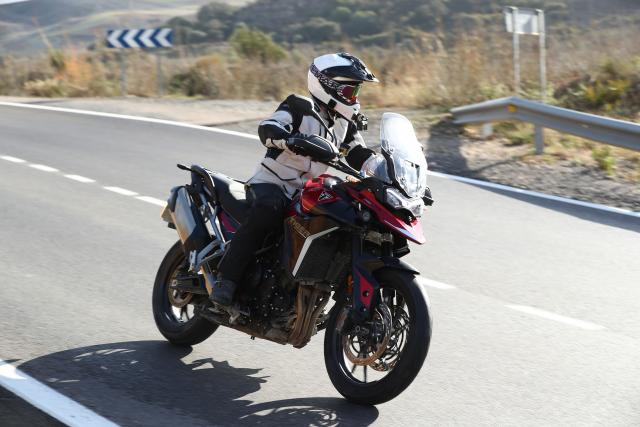 It’s not the full and fancy semi-active system at both ends, as found on the bigger Tiger 1200s, but instead an electronically adjusted rear shock absorber, and on a bike like this it makes a lot of sense. The front and rear suspension on all bikes in the range is from Marzocchi, and on the GT Pro you’ve got 45mm fully adjustable USD forks and the aforementioned rear shock which features adjustable preload and rebound damping. 180mm of travel at the front and 170mm at the rear sounds like quite a lot, but the set up of the suspension seems bang on for this sort of riding. It’s got a bit of give on the brakes, and you can feel it pitch forward, but it doesn’t feel wayward or like it’s getting away from you. Should you need to chuck another person on the back, or stack it high with luggage, you are also then saved the hassle of cracking out the C-spanner, and instead just a few clicks of the five way joystick will have you set for either solo riding, rider-and-pillion, or fully loaded - both a pillion and luggage.
