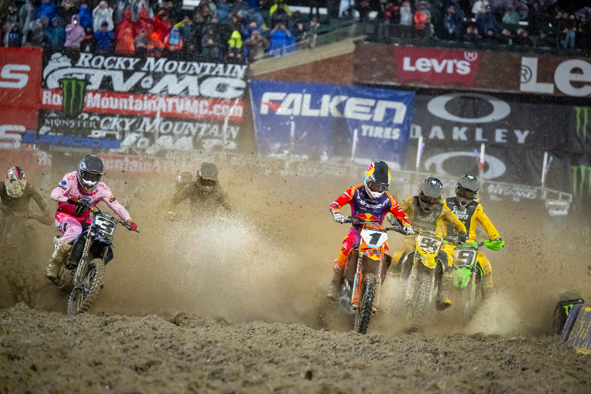 Jett Lawrence, the winner of the season-opener (making history in the process by becoming the first rider ever to win their first premier class AMA Supercross race), finished down in ninth in San Francisco, in what was his first mud race as a full-time 450 rider. This does not mean the #18, who won four titles in the 250cc class and went unbeaten on his way to the 450MX title in AMA Pro Motocross last year, is hopeless in the mud, though: last year’s East Rutherford Supercross saw conditions not much better than those seen last weekend, and Lawrence finished second to Britain’s Max Anstie in the 250SX class that night.