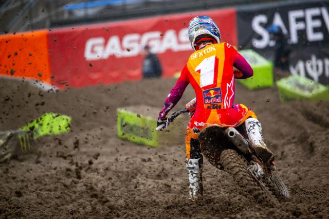 In the 450s, Chase Sexton led wire-to-wire, taking his first supercross win as champion and as a KTM rider, having switched from Honda over the off-season. Sexton’s win was made possible by one particular bit of luck, as he timed the gate drop to absolute perfection to take the holeshot, after which he managed the conditions perfectly.